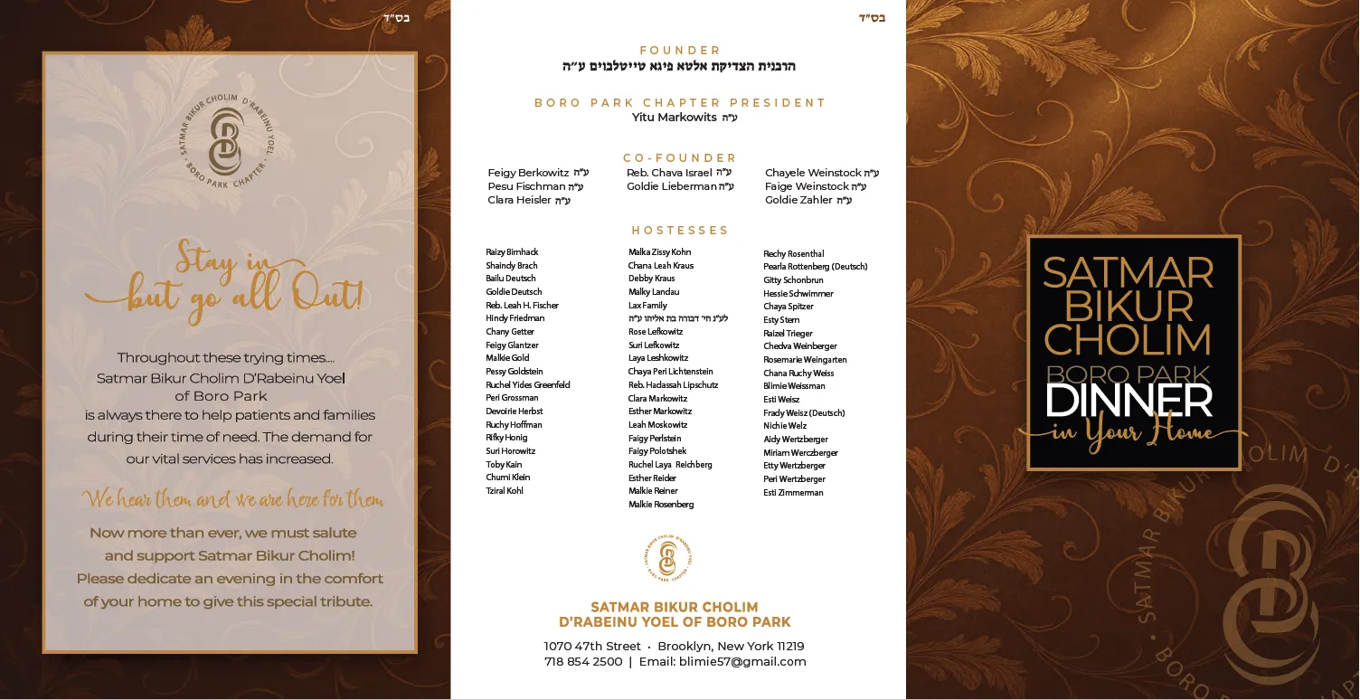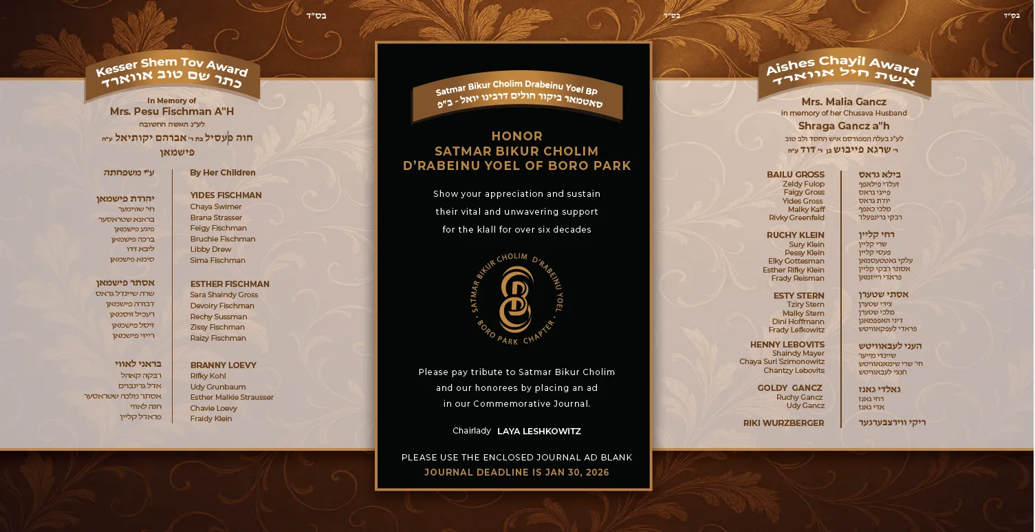 Please pay tribute to Satmar Bikur Cholim and our honorees by placing an ad in our Commemorative Journal.