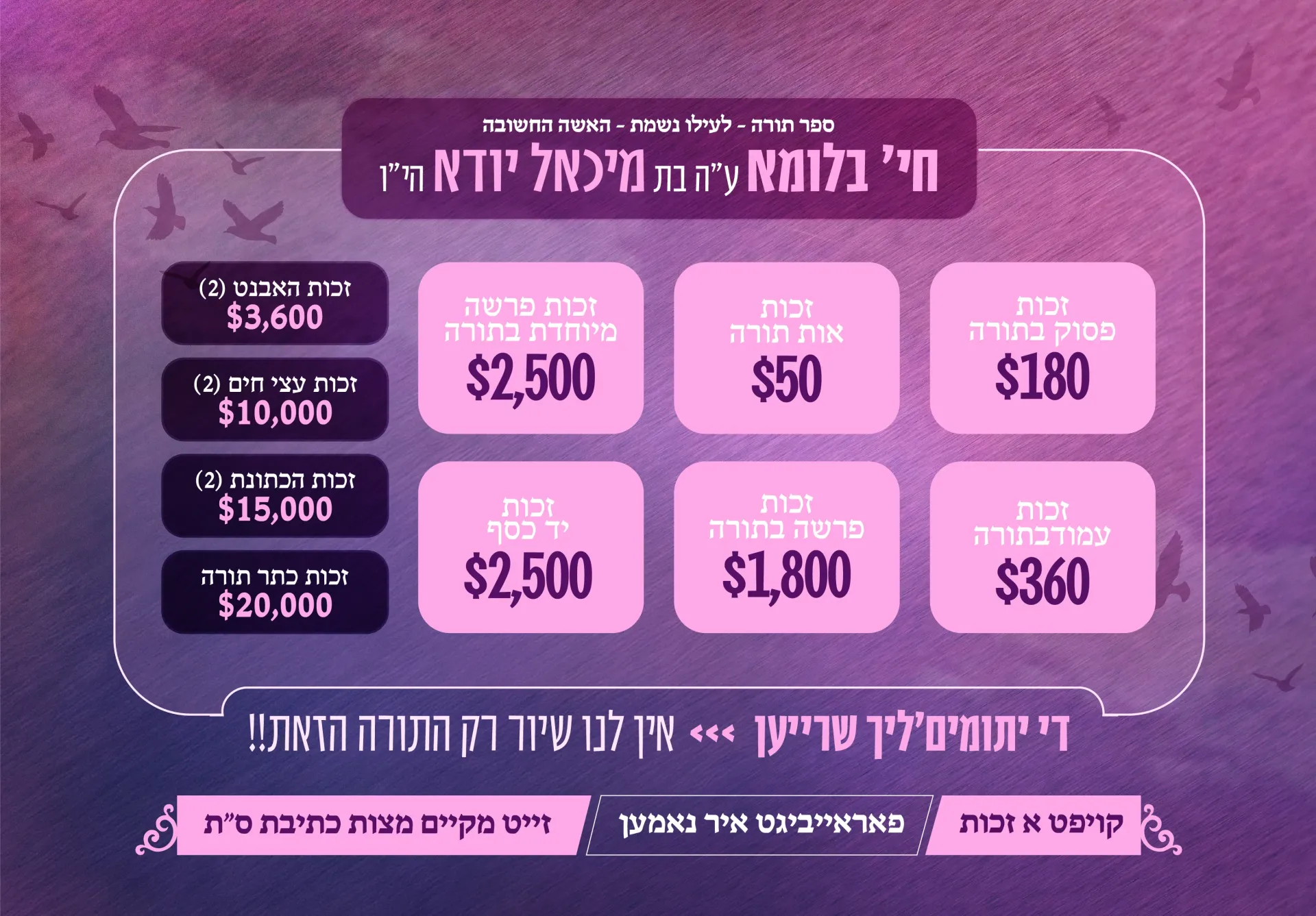 איר גוף קענען מיר ליידער נישט צוריקברענען, אבער מיר כאטש טון פאר איר נשמה, אז זי זאל שעפן א נחת רוח אויבן אין הימל, דורך דעם ספר תורה וואס מען וועט שרייבן לעלוי נשמתה. און בזכות זה זאל זי זיין א מליצת יושר פאר איר גאנצע משפחה, און פאר אלע משתתפים און תומכים לכל טוב סלה.