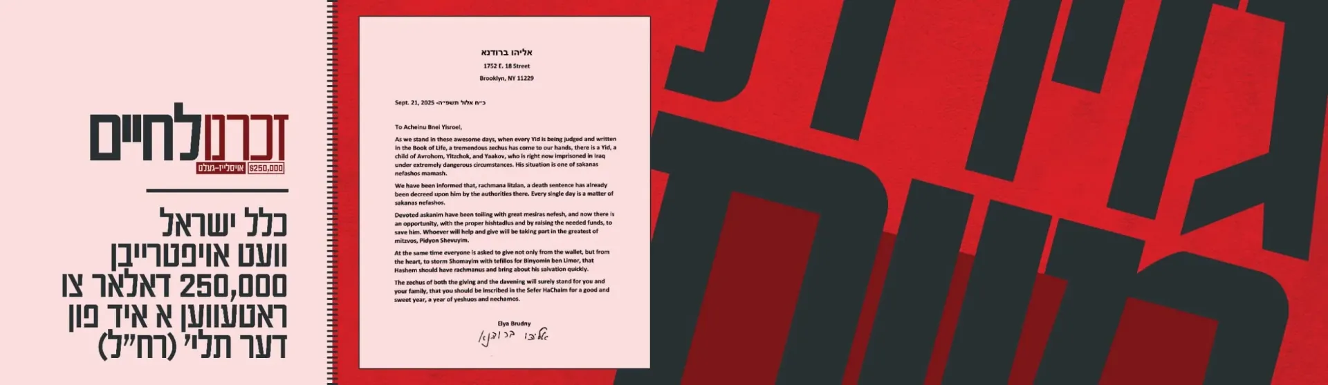 $101.00Time is running out for a young Jewish man facing execution. Us Yidden must unite NOW to save a life. The "Zachreinu L'Chaim" campaign has launched what may be our final opportunity to rescue Binyamin Chasin, a 30-year-old Yid sitting on death row in an Iraqi prison. With just $250,000 standing between life and death, this is our moment to show what it means to be responsible for one another.